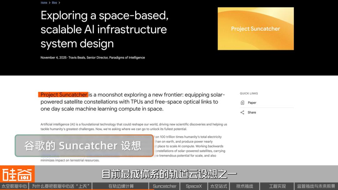 目前最成体系的轨道云设想之一,来自谷歌内部的Suncatcher Projec(“捕光者”计划),它的核心思路是:在轨道上部署相对固定位置的算力平台,通过持续稳定的太阳能供电,为地面的数据中心提供算力补充。