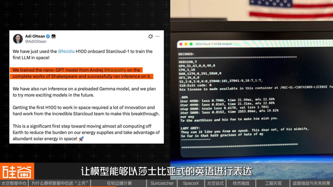 截至目前,它在太空中完成了几个重要任务:一是成功调用了谷歌的开源模型Gemma,并向地球发出了“Hi地球人,你们好”的问候,仿佛一个地外智慧生命;二是使用莎士比亚全集训练由OpenAI创始成员Andrej Karpathy打造的NanoGPT,让模型能够以莎士比亚式的英语进行表达;三是实时读取传感器数据,进行实时情报分析,比如瞬间识别野火热信号等,并及时通知地面人员。