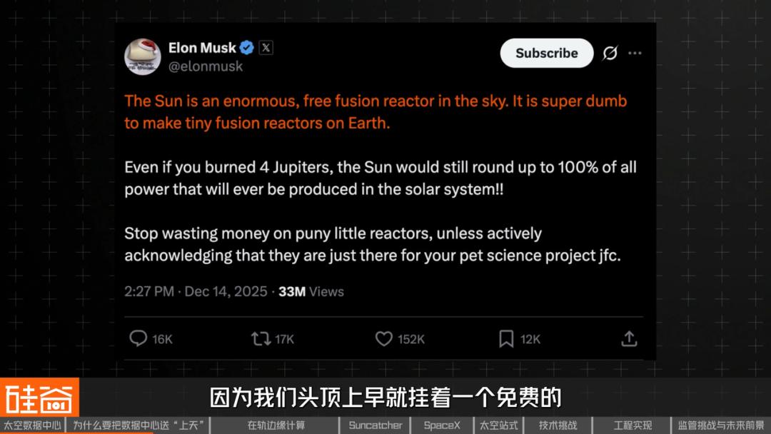 如今为了获取能源,很多投资者们都去研究制造小型聚变反应,马斯克对此表示这完全是多此一举,因为我们头顶上早就挂着一个免费的、不会熄火的终极能量源。