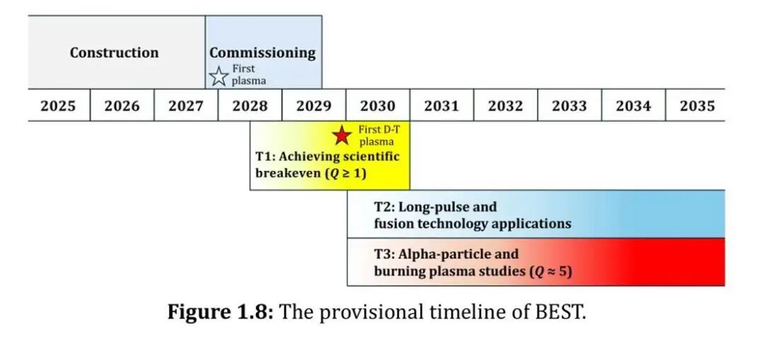 Q≥1需要完成哪些验证目标?“国家队”的中国紧凑型聚变能实验装置BEST,详尽披露了它的“研究计划”(BEST-Research-Plan-v1.1)。该实验装置计划于2027年建成,并于同年底实现首束等离子体放电(First plasma);2030年底前首次尝试氘-氚聚变(First D-T plasma),期间实现对科学Q≥1的验证。之后,它将尝试长脉冲运行(Long-pulse),即让核聚变反应稳态运行;以及燃烧等离子体,验证Q≈5。期间,BEST还将验证氚增殖,即利用聚变产生的中子与包层中的锂撞击,在反应堆内部“炼”出稀缺的氚燃料。