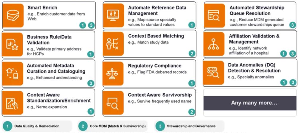 这就需要更具体的用例了。下图 3 展示了 11 个基于人工智能的 Gen AI 赋能的 MDM 实际用例。其中一些用例可能与之前的示例类似,而另一些则是全新的。