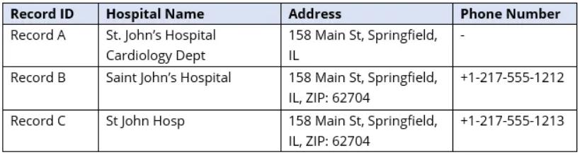 然而,系统常常忽略记录 C 与记录 C 是同一实体。电话号码和缩写名称(“圣约翰医院”)的一位数差异足以阻止自动匹配,迫使数据管理员手动调查差异。