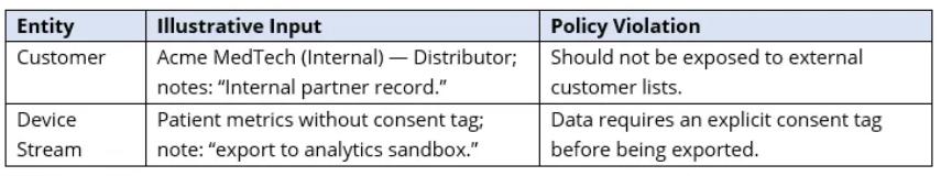 它可能会错过客户记录中的“内部合作伙伴”等语义线索,或者患者指标数据流中缺少“同意标签”。