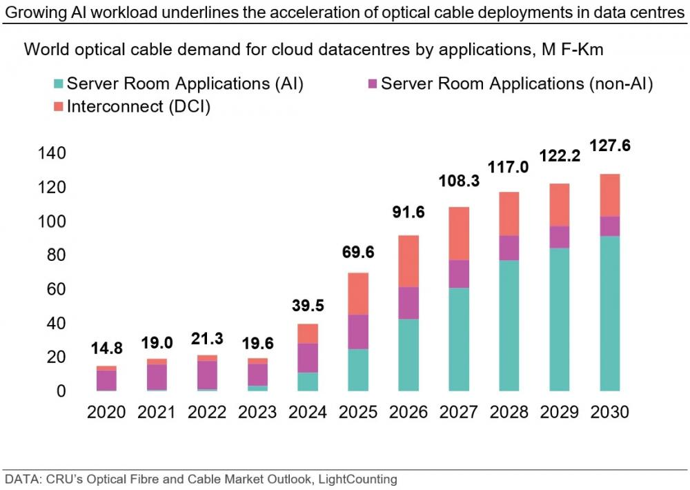 光纤光缆行业独立调研机构英国商品研究所(CRU)提到,AI训练、推理集群的快速扩张要求服务器机房内部建立高密度光纤连接,而日益互联的超大规模数据中心园区则推动了新一轮数据中心互连建设热潮。这些应用场景依赖低损耗设计、更高规格的光纤(如弯曲不敏感光纤)以及极高纤芯数的光缆结构,使得数据中心相关需求成为市场增长的核心。