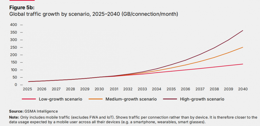 报告预测,在最保守增长情景下,全球移动流量在2030-2040年间年均增长约10%,到2040年达到1700 EB/月;在最高增长情景下年均增长超过20%,2040年接近4000 EB/月。