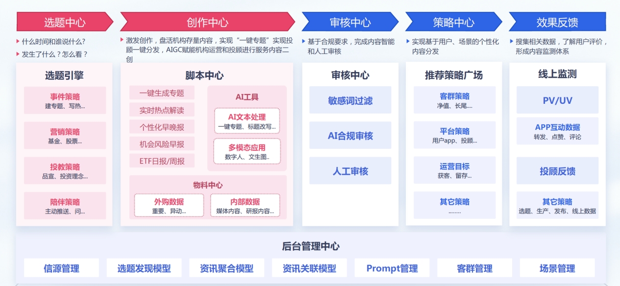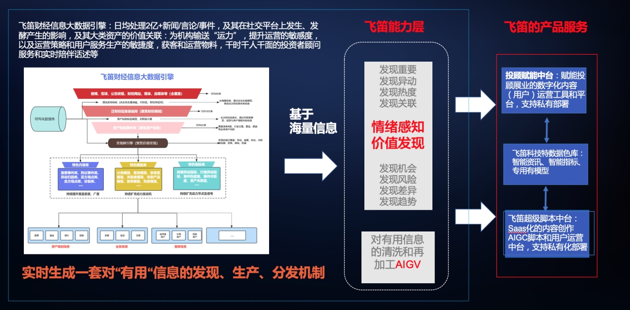 飞笛财经信息大数据引擎通过海量公网信息获取非结构化数据,结合飞笛众多自研的专家模型和知识库,提取有价值的数据,再围绕不同金融场景需求生成带内容标签的数据信息,最终封装成满足多场景敏捷适配需求的数据模块和内容产品,如持仓陪伴内容策略数据、热点运营内容策略数据、用户成长安抚内容策略数据。