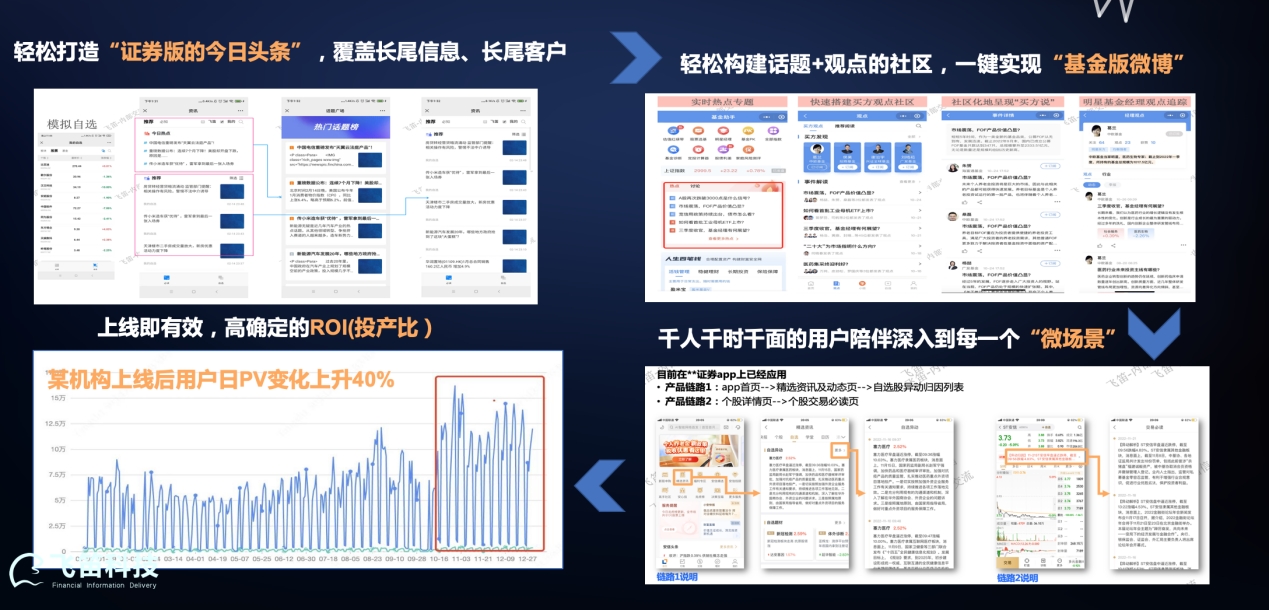 对金融机构运营平台部门来说,将上述带有内容标签的数据模块通过API接入企业客户端后,结合金融机构用户运营思路,就可以在前端为用户推出千人千面、千场景千面、千投顾千面、千策略千面的内容,实现如证券版的今日头条、基金版的微博、用户关注的自选股异动解读推送等。