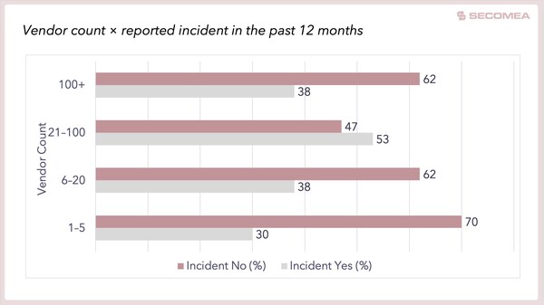 随着供应商生态系统的扩展,事件发生的可能性急剧上升。 管理着21至100家外部供应商的组织,其风险暴露程度最高。 风险集中在那些供应商会话可见性不完全且凭证审核不频繁的环节。
