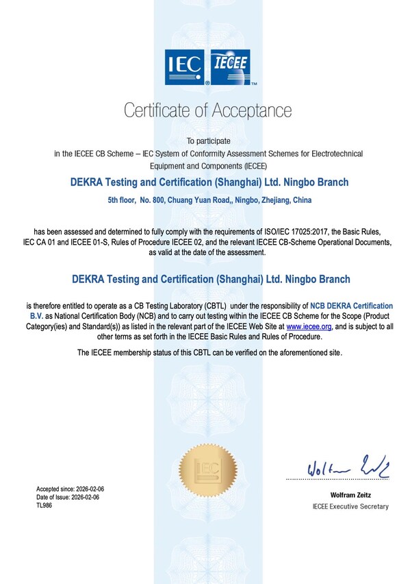 宁波2026年3月5日 /美通社/ -- 近日,DEKRA德凯宁波分公司顺利通过国际电工委员会(IECEE)的首次评审,成功获得包括灯具、家用电器、电器附件在内的多项标准CBTL资质。这一重要里程碑不仅彰显了DEKRA德凯在测试与认证领域的专业实力,也进一步强化了其对宁波及周边地区的本地化服务能力。