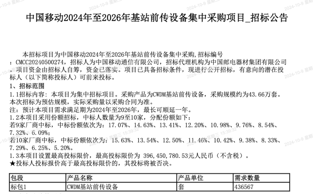 C114讯 10月9日消息(九九)中国移动今日发布2024年至2026年基站前传设备集中采购招标公告。该项目为集中招标项目,采购产品为CWDM基站前传设备,采购规模约为43.66万套(实际采购量以采购合同为准)。