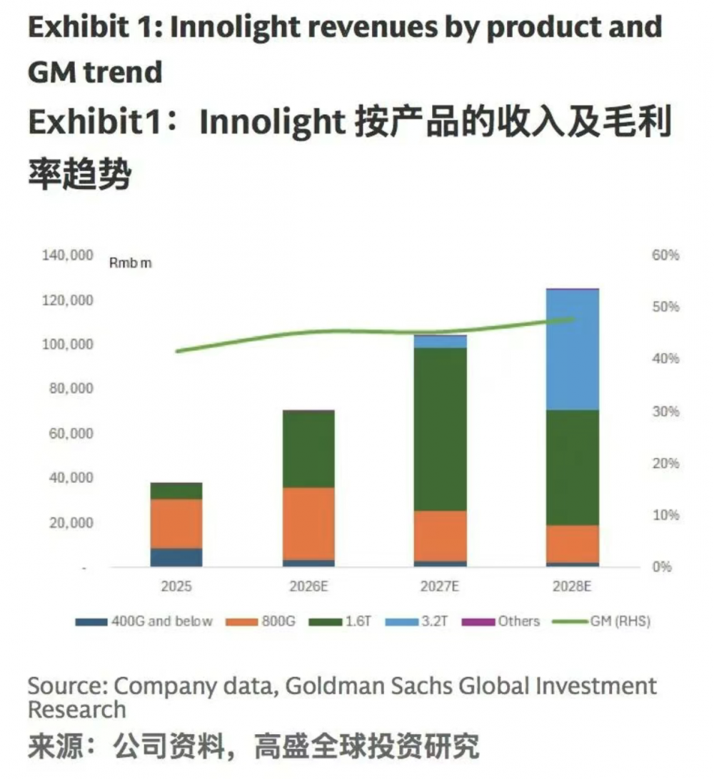新的光器件可能包括OE、FAU、ELS模块、OCS等,并且在竞争加剧的情况下,同类产品的平均销售价格和毛利率下滑是正常现象。高盛预计,中际旭创将在2028年前通过其产品组合从EML向硅光(SiPh)迁移,以及从800G向1.6T/3.2T升级,继续推动整体毛利率的提升。这种快速的产品迁移,还可能导致客户承担更高的转换成本,从而促进更激烈的竞争。
