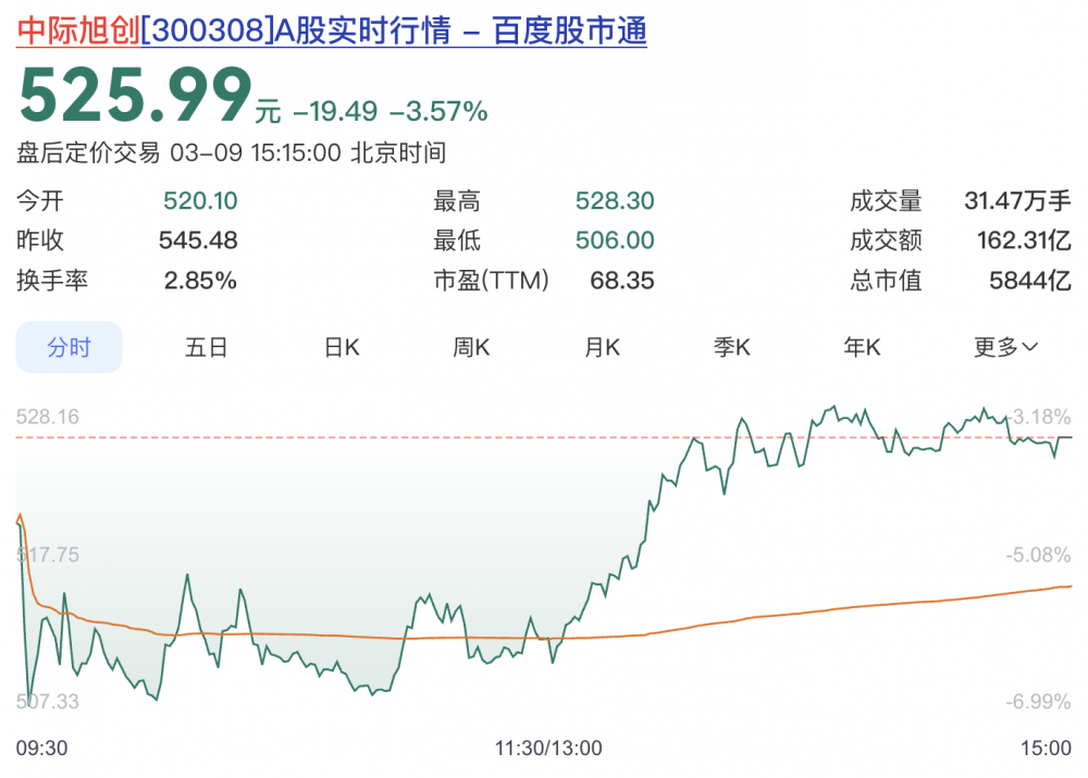 截至3月9日收盘,中际旭创股价525.99元,市值5844亿元。