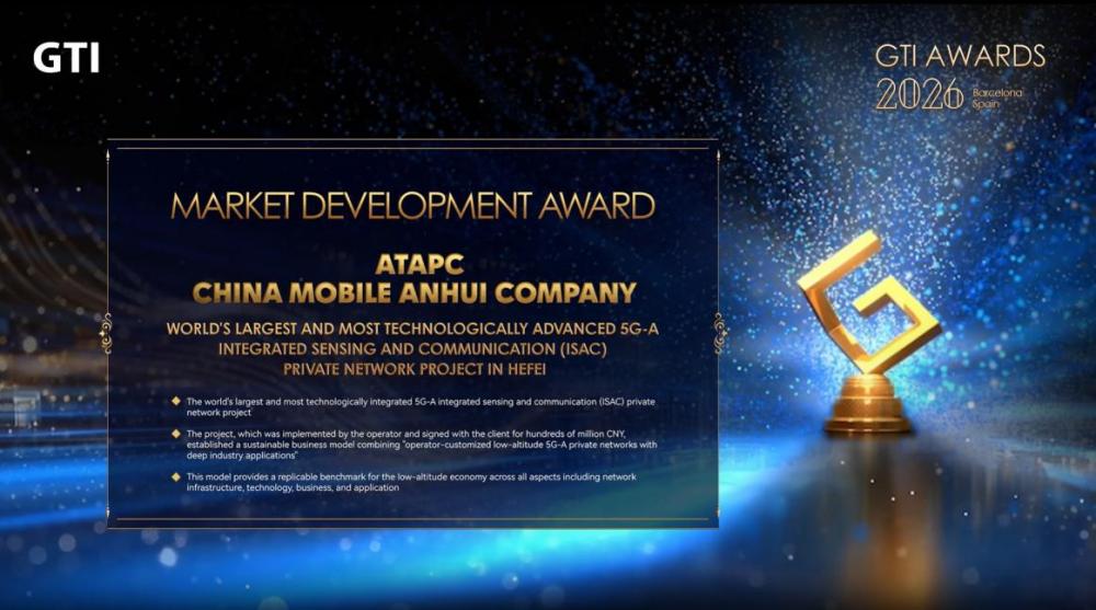 近日,在MWC2026巴塞罗那世界移动通信大会期间,由安徽移动联合国际先进技术应用推进中心(合肥)(简称国先中心)打造的合肥5G-A通感一体(ISAC)专网项目,成功斩获GTI Awards 2026“市场发展奖”。这一奖项是对安徽移动和国先中心在5G-A技术创新、低空经济产业落地及商业生态构建方面突出贡献的高度认可,也标志着我国5G-A赋能低空经济的“合肥模式”走向全球,成为国际低空智联发展的标杆。