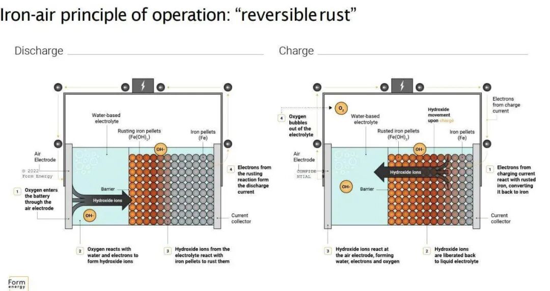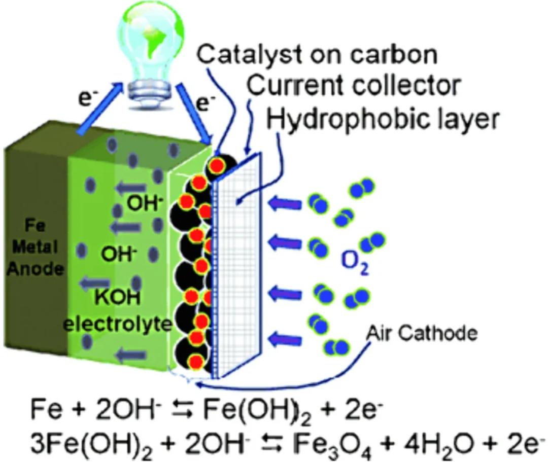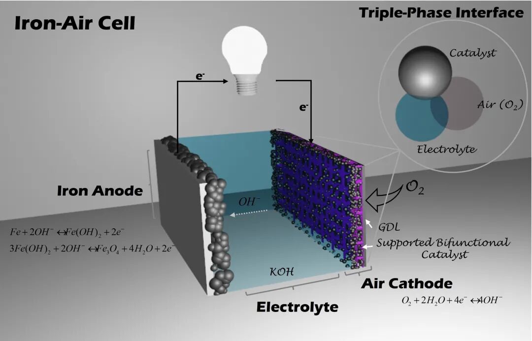 如果想要回答以上两个问题,那么首先需要弄清楚的是铁空气电池的工作原理——
