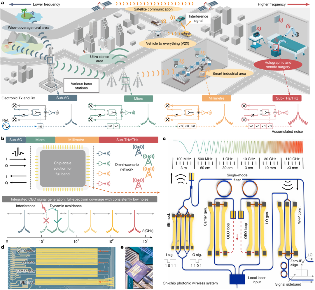 本月初,北京大学电子学院王兴军教授-舒浩文研究员团队联合鹏城实验室等机构,在《自然》杂志发表论文《全频段无线通信的超宽带集成光电融合芯片》,首次实现“光纤-无线融合通信”。实验显示,光纤通信单通道传输速率达 512Gbps,太赫兹无线通信单通道达 400Gbps—— 相比之下,现在的万兆宽带也就是个小水管。