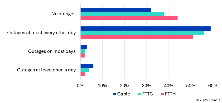 澳大利亚的NBN Co就是一家报告了其运营的不同网络故障率的运营商。2025年5月,其cable网络每天至少断网一次的连接比例为6%,而FTTP仅为2%,光纤到路边(FTTC)连接为4%(见图2)。该运营商还报告称,2022年其cable网络的服务保障上门维修率(即为解决仅一个住所的问题而进行的上门维修)几乎是FTTP网络的两倍。在NBN Co的2022财年,每100个活跃cable服务大约需要0.65次服务保障上门维修,而每100个活跃FTTP服务则需要大约为0.35次。服务保障上门维修占总上门维修的绝大部分,但也包括一些针对影响多个用户的网络保障服务上门维修。