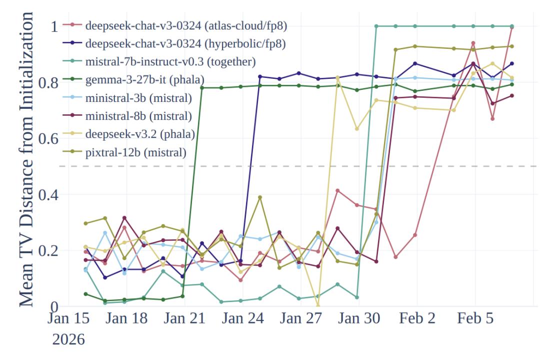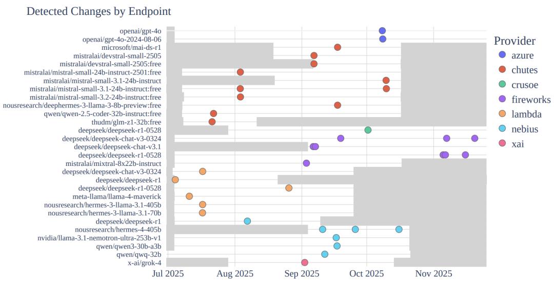 由于权重的微调、量化或架构变动都会导致这一分布发生偏移,对数概率成为了监测后台变动的最敏感指标。