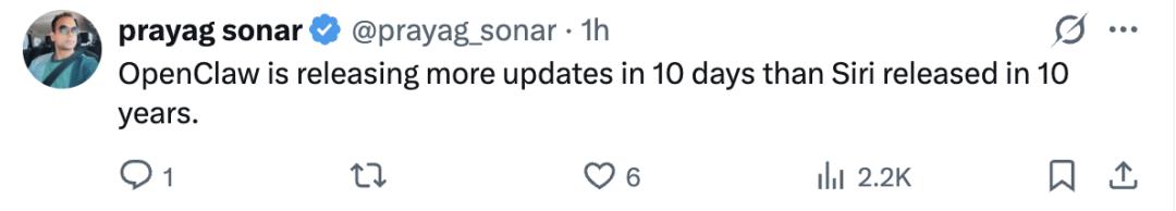 龙虾10天更新的功能,比Siri 10年更新的还要多!