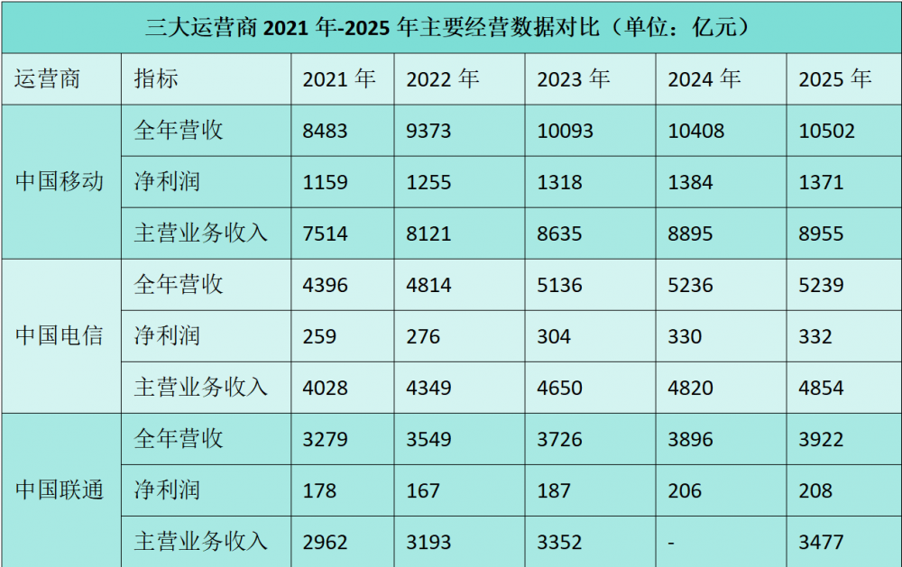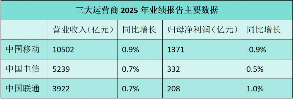 C114讯 3月30日消息(九九)截至3月26日晚,中国联通、中国电信、中国移动相继发布2025年业绩报告。从主要数据来看,三大运营商整体经营稳健,甚至有点过于“稳”了!