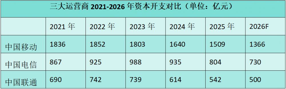 具体来看,中国移动2025年资本开支为1509亿元,同比下降8.0%,2026年中国移动资本开支计划为1366亿元,同比继续下降9.5%;中国电信2025年资本开支为804亿元,较2024年下降14%,2026年中国电信全年投资计划730亿元,同比继续下降9.2%;中国联通2025年资本开支542亿元,2026年预计进一步降至500亿元左右。
