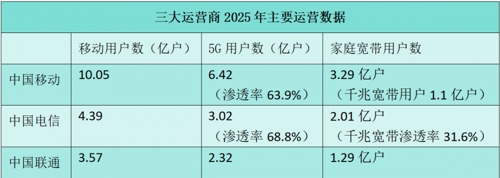 具体来看,中国移动2025年通信服务收入7149亿元,同比下降1.0%,其中语音和短彩信业务收入持续收缩,这一形势主要源于个人与家庭市场的极度饱和。截至2025年底,中国移动的移动客户数达到10.05亿户,几乎覆盖了所有潜在用户,5G网络客户数虽增长16.2%,但移动ARPU却从上年的48.5元降至46.8元。这意味着单纯的5G用户迁移并未带来显著的价值提升,流量红利已消耗殆尽。在家庭市场,尽管千兆宽带客户数增长近10%,但家庭客户综合ARPU仅微增1.6%,宽带业务同样陷入“增量不增收”的困境。