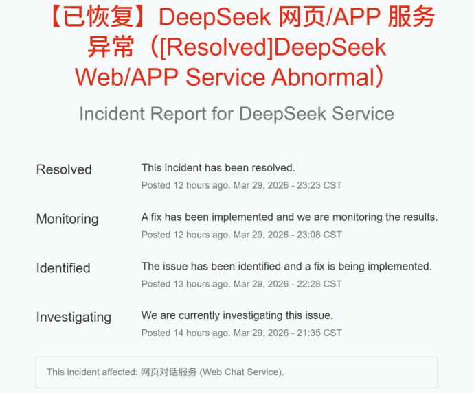 我们先来回顾一下这次事故吧,3月29日晚到3月30日上午,DeepSeek出现了一次持续10多个小时的异常。