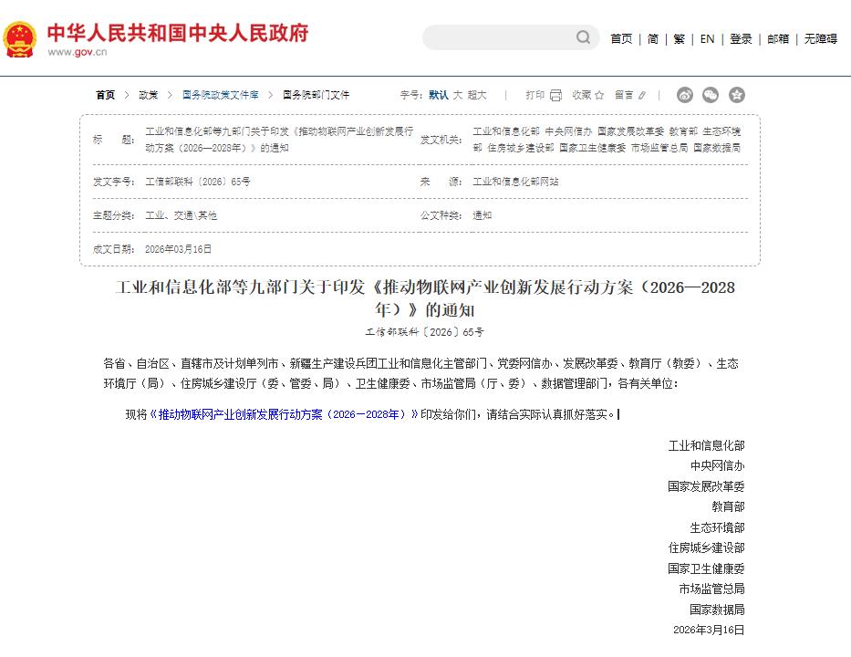 3月31日,工信部等九部门联合印发了《推动物联网产业创新发展行动方案(2026—2028年)》(以下简称《行动方案》)。这份重磅文件给出了极具雄心的量化目标:到2028年,物联网终端连接数力争达到百亿级规模,物联网核心产业规模突破3.5万亿元。