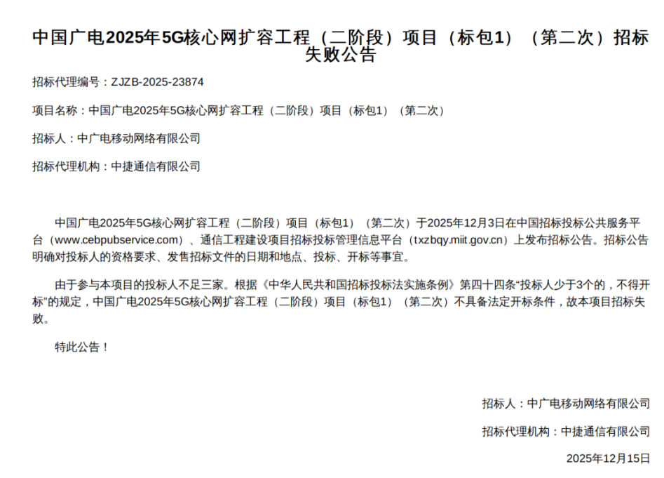 值得注意的是,作为项目核心的标包1此前已历经波折。该标包曾于2025年11月24日和12月3日先后两次组织招标,拟采购一家供应商提供核心网、网络云等相关系统的扩容,采购预算金额为不含税55,264万元,含税62,448万元。然而,由于每次投标人均不足三家,两次招标均以失败告终。