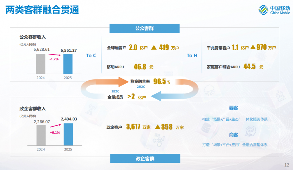 中国移动则以“移动爱家”品牌为引领,千兆宽带客户突破1.1亿户,FTTR客户净增1464万户,通过“宽带+应用+权益”的融合模式,提升家庭客户综合ARPU(同比增长1.6%)。
