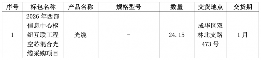C114讯 4月10日消息(水易)来自中国电信阳光采购网消息,中国电信成都分公司2026年西部信息中心枢纽互联工程空芯混合光缆采购项目正式启动,预估规模为1937554.50元(含税)。