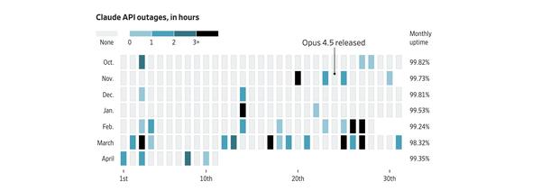 互联网核心服务的可靠性通常以“9”为衡量标准,四个“9”(99.99%的正常运行时间)是软件公司向客户承诺的常规标准,但截至4月8日,Anthropic的Claude API在过去90天内的正常运行时间仅为98.95%。