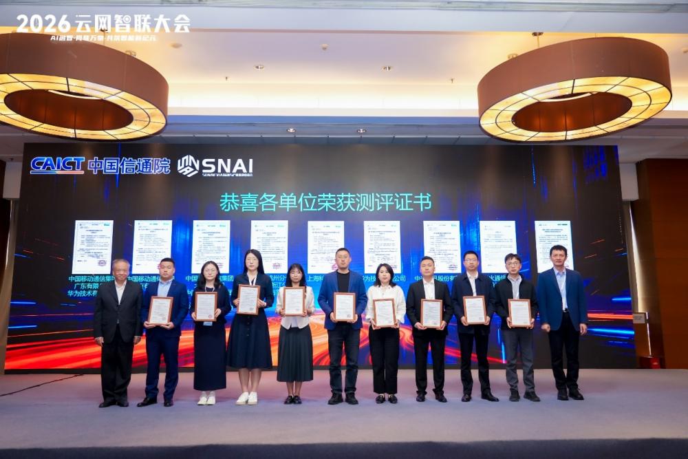 2025年,CCSA TC610推委会与产业伙伴通力合作,通过技术标准研制、方案试验验证、评估测试等方式,加速推动网络的自动化、智能化演进。在过去一年,行业又涌现出一批网络能力产品和解决方案,通过了中国泰尔实验室网络能力水平检测。本次大会邀请闻库理事长和敖立副院长共同为广东移动、北京移动、杭州电信、上海科技大学、华为、中兴、烽火通信、紫金山实验室颁发网络能力等级测评证书。