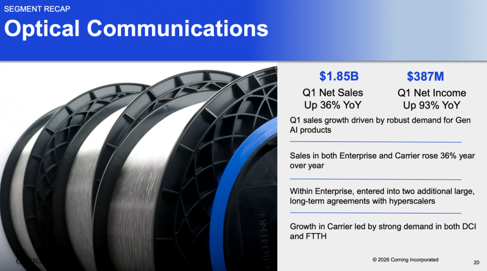 C114讯 4月29日消息(水易)近日,康宁公布2026年第一季度业绩。报告期内,康宁实现营收核心销售额为43.5亿美元,同比增长18%。其中,其中光通信业务18.5亿美元,同比增长36%,净利润3.87亿美元,同比增长93%。