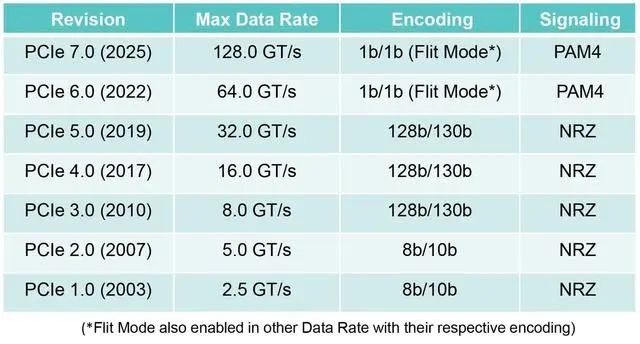 为了实现令人印象深刻的数据传输速率,与 PCIe 5.0 和 6.0 相比,PCIe 7.0 将物理层的总线频率提高了一倍。除此之外,该标准保留了具有四级信令 ( PAM4 ) 的脉冲幅度调制、1b/1b FLIT 模式编码以及已用于 PCIe 6.0 的前向纠错 ( FEC ) 技术。除此之外,PCI-SIG 表示 PCIe 7.0 规范还侧重于增强的通道参数和覆盖范围以及提高的功率效率。