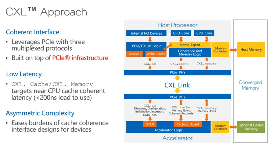 眼看着大家都在革PCIe的"命",在2019年3月份Intel推出了CXL(Compute Express Link)协议接口,将CXL协议封装到PCIE链路层数据包中传送,并在CPU端的PCIE总控后端按照事务标识分流CXL专属事务给CXL处理逻辑处理。
