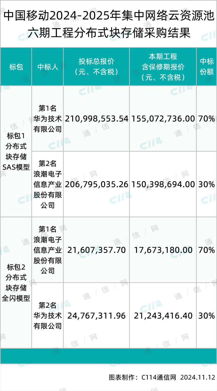 在集中网络云资源池六期工程分布式块存储采购项目中,华为和浪潮两家分食了全部份额,其中,华为斩获分布式块存储SAS模型标包70%份额以及分布式块存储全闪模型标包30%份额,中标总金额约为155129181.1元(不含税);浪潮获得分布式块存储全闪模型标包70%份额以及分布式块存储SAS模型标包30%份额,总中标金额约为77163660.97元(不含税)。