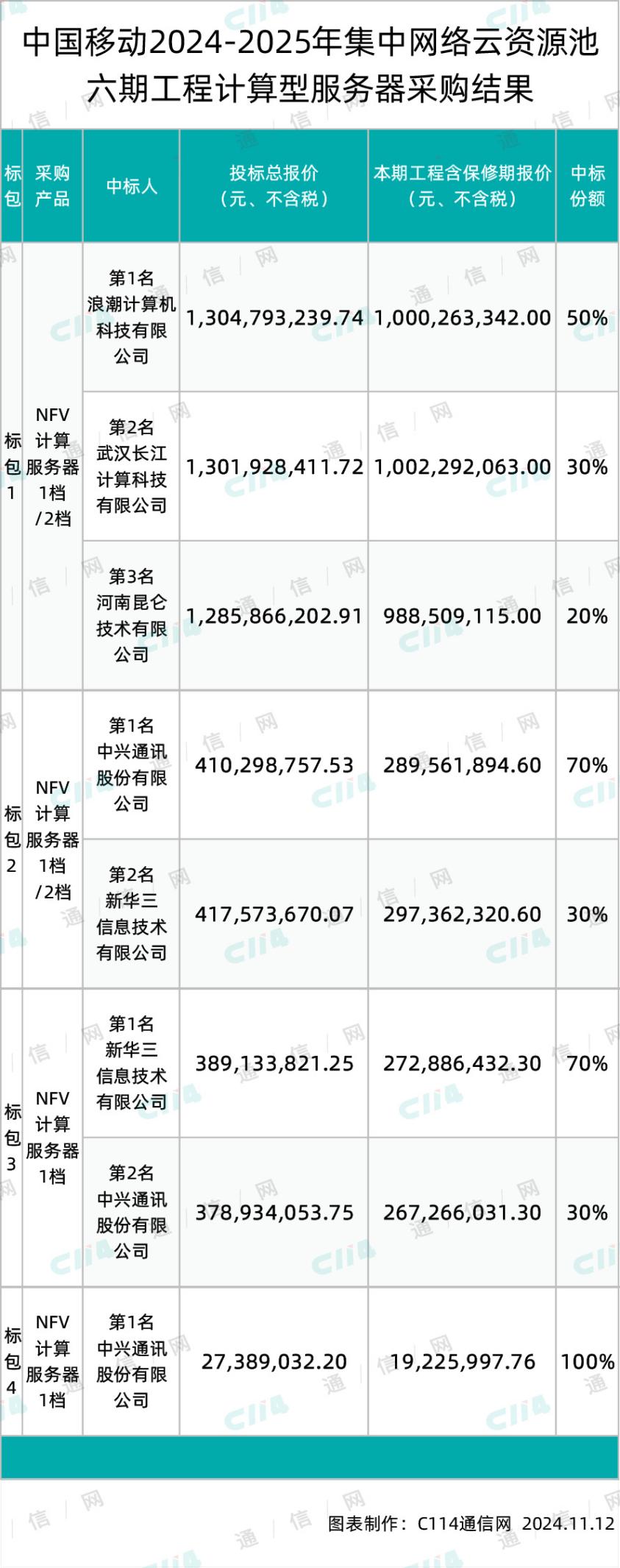 从中国移动公示的中标结果看,集中网络云资源池六期工程计算型服务器集采项目共计5家中标,其中最大的标包1由浪潮、长江和河南昆仑三家瓜分,浪潮斩获半数份额,总中标金额约为652396619.9元(不含税),长江获得30%份额,总中标金额约为390578523.5元(不含税),河南昆仑获得20%份额,总中标金额约为257173240.6元(不含税)。其余3个标包则由中兴和新华三两家分食,其中,中兴获得标包2的70%份额、标包3的30%份额,以及标包4的全部份额,总中标金额约为428278378.6元(不含税);新华三获得标包2的30%份额和标包3的70%份额,总中标金额约为397665775.9元(不含税)。