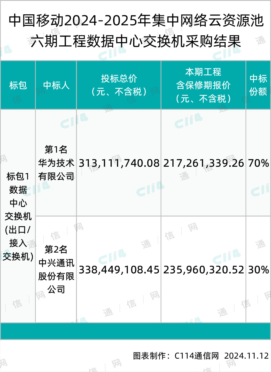 在集中网络云资源池六期工程数据中心交换机采购项目中,华为和中兴两家分食了全部份额,其中,华为斩获70%份额,总中标金额约219,178,218.056元(不含税),中兴获得30%份额,总中标金额约为101,534,732.535元(不含税)。