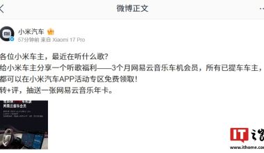小米汽车:所有已提车车主可免费领取 3 个月网易云音乐车机版会员