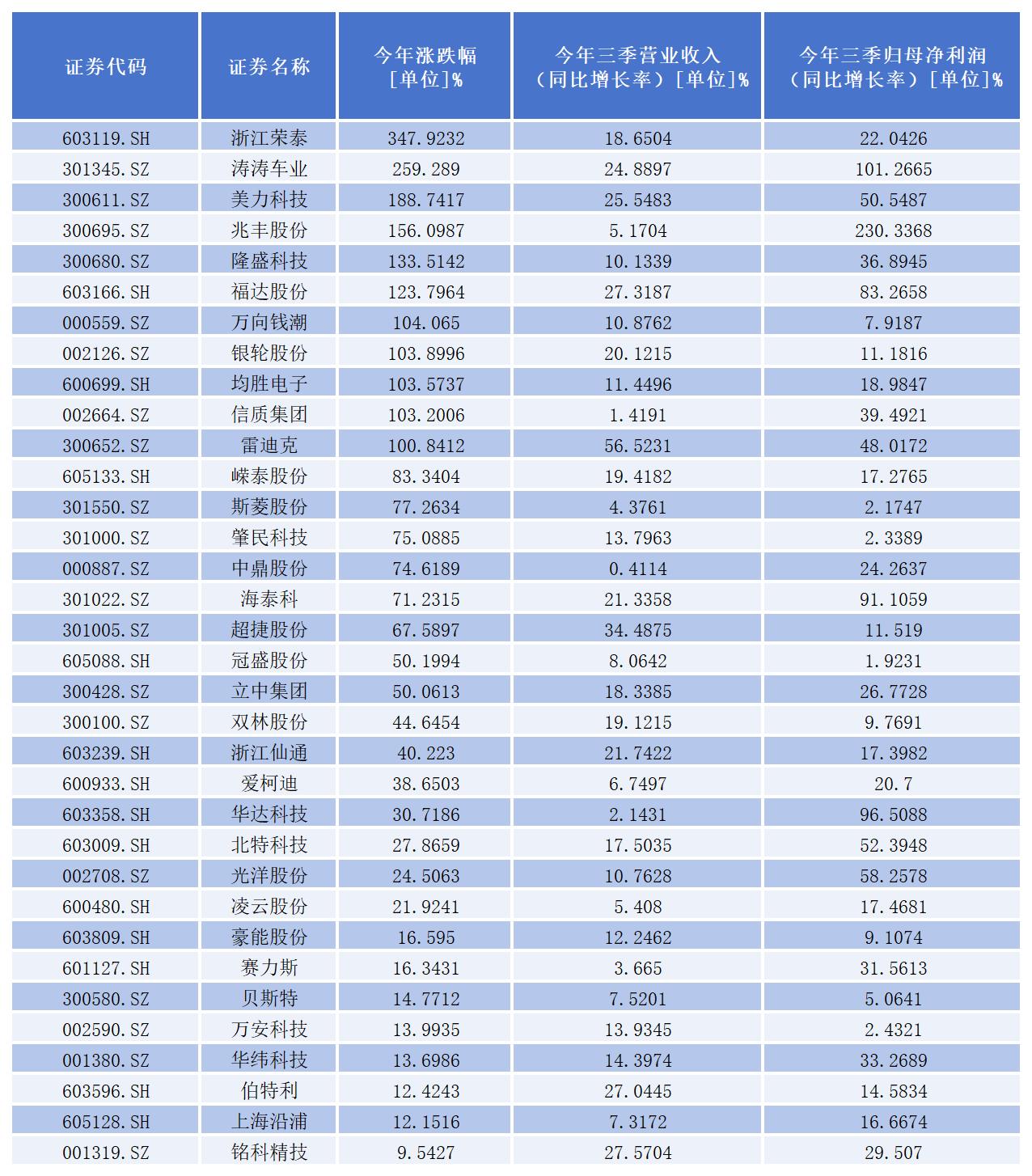 据览富财经统计,今年前三季度实现营业收入、归母净利润均同比增长,且截止10月31日收盘年内股价出现上涨的有32家上市公司。