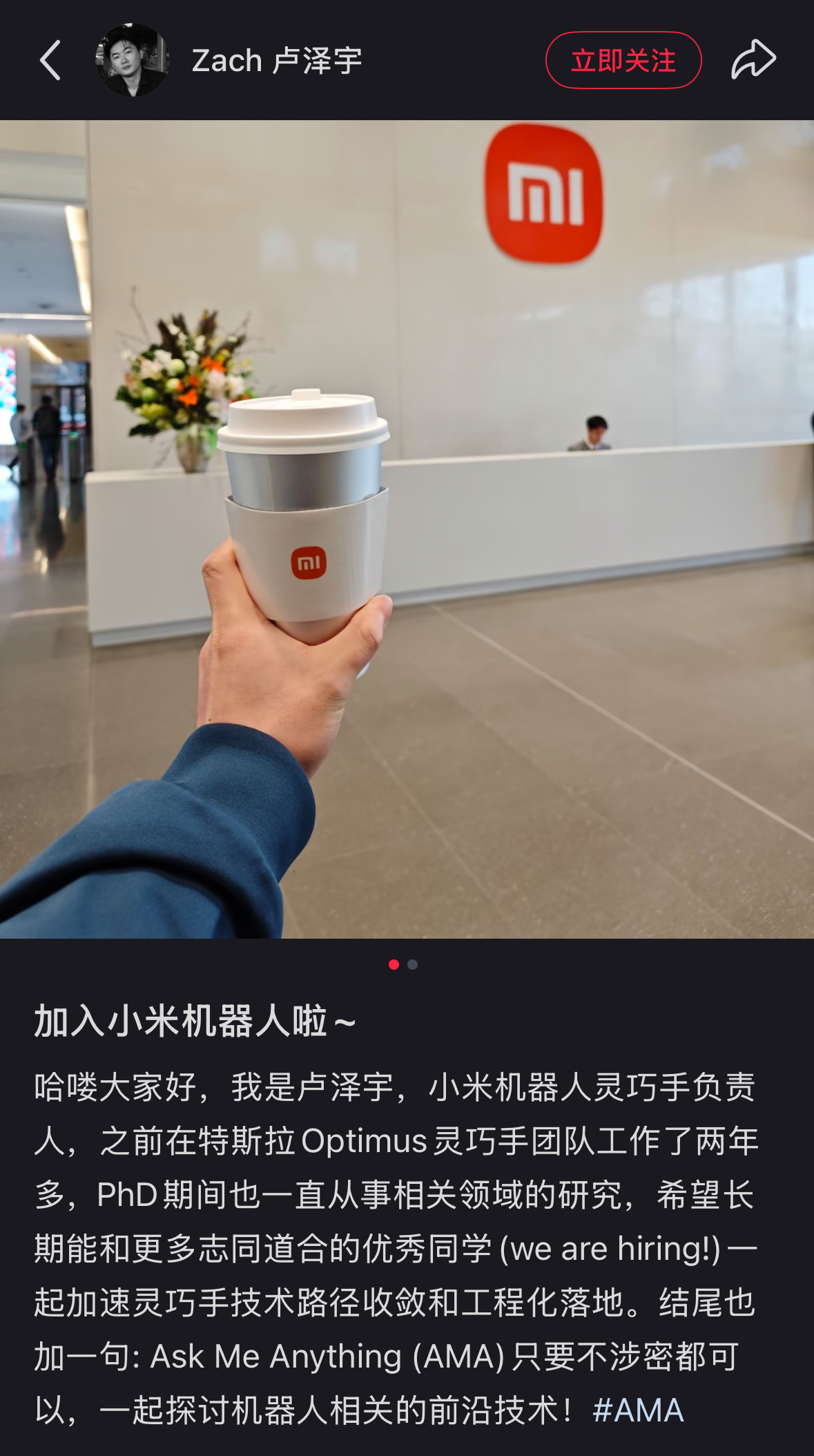 据卢泽宇自述,加入小米之前,他在特斯拉Optimus灵巧手团队工作了两年多,读博期间也一直从事相关领域的研究。他特别强调,在社交平台上网友可以问他任何问题,“只要不涉密都可以,一起探讨机器人相关的前沿技术。”