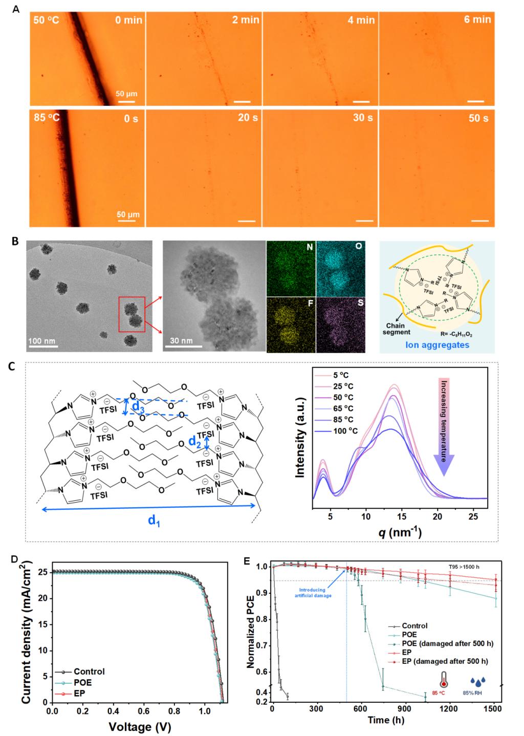 基于该材料设计与愈合机制,封装层展现出优异的综合性能,它不仅具备高透明度、强附着力与优异的水氧阻隔性,更通过自愈合物理屏障与化学吸附的协同作用,在模拟暴雨等恶劣条件下对铅泄漏实现了超过99%的抑制效率。封装器件在加速老化测试中表现出长期稳定性,经过1500小时的湿热测试和300次热循环后,EP封装器件分别保持了其初始效率的95.17%和93.53%。本研究通过将“被动封装”升级为“主动修复”,为钙钛矿光伏技术的可靠性提供了关键解决方案。