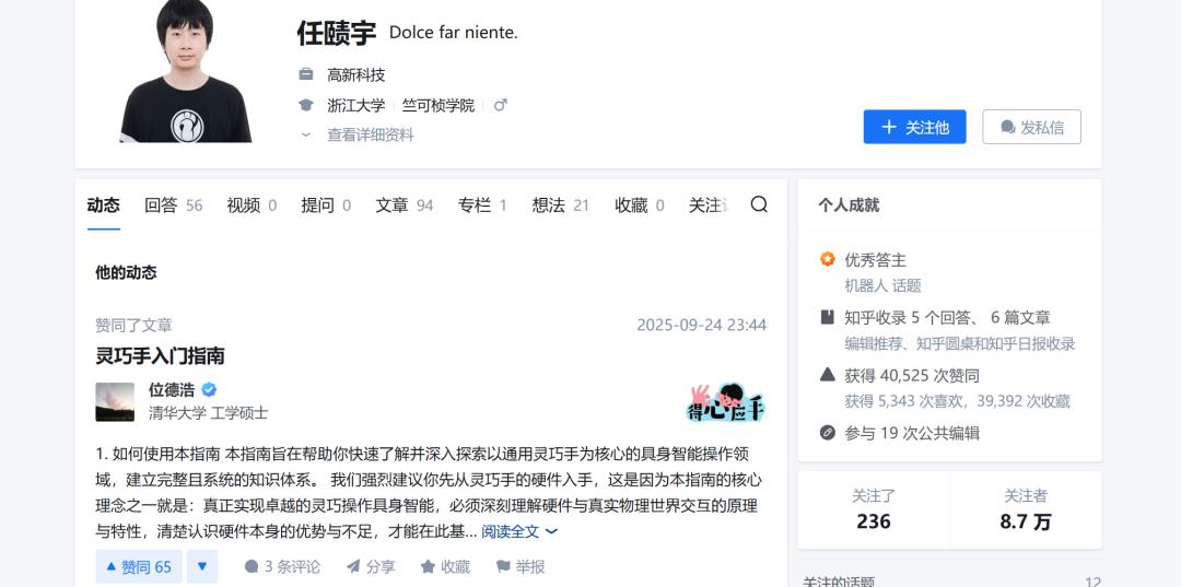 任赜宇是机器人领域的大 V,在知乎上拥有约 8.6 万粉丝。他曾在个人知乎主页上详细分享了研发小米机器人“铁大”的心理路程,描述“为了研发,连续 26 天吃住在公司”的攻坚细节。