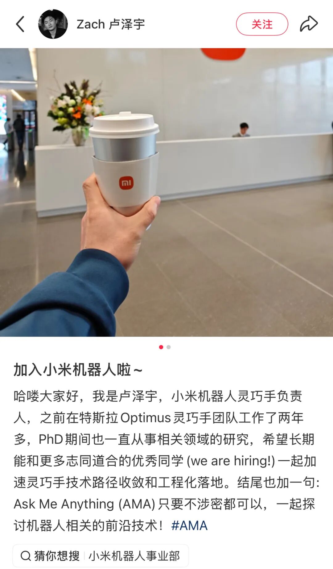 小米聘请卢泽宇,凸显了该公司在提升机器人灵巧性方面的雄心——这是迈向下一代人形机器人平台的关键能力...”