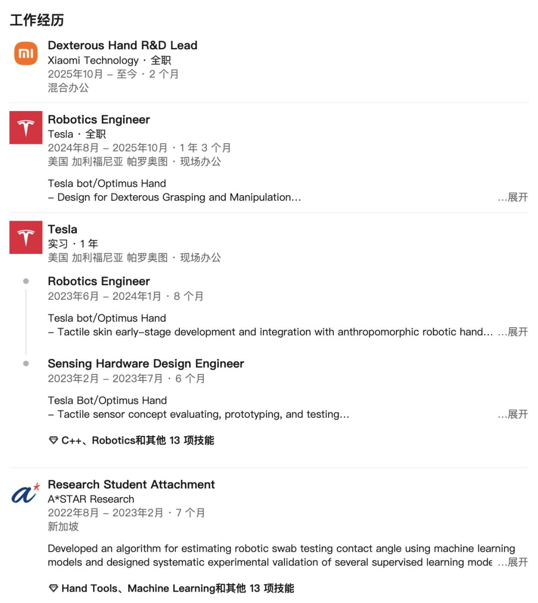 在特斯拉工作的 2 年多时间内,他深度参与Optimus 机器人的手部研发,包括触觉传感器开发、灵巧抓取与操作、手部结构设计等关键技术——工作履历对口堪称完美。