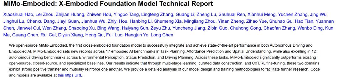 值得注意的是,从罗福莉官宣入职小米,到她所在团队推出首个成果(MiMo-Embodied)还不到 10 天,这个大模型成功解决了自动驾驶与具身智能两大领域长期存在的知识迁移难题。