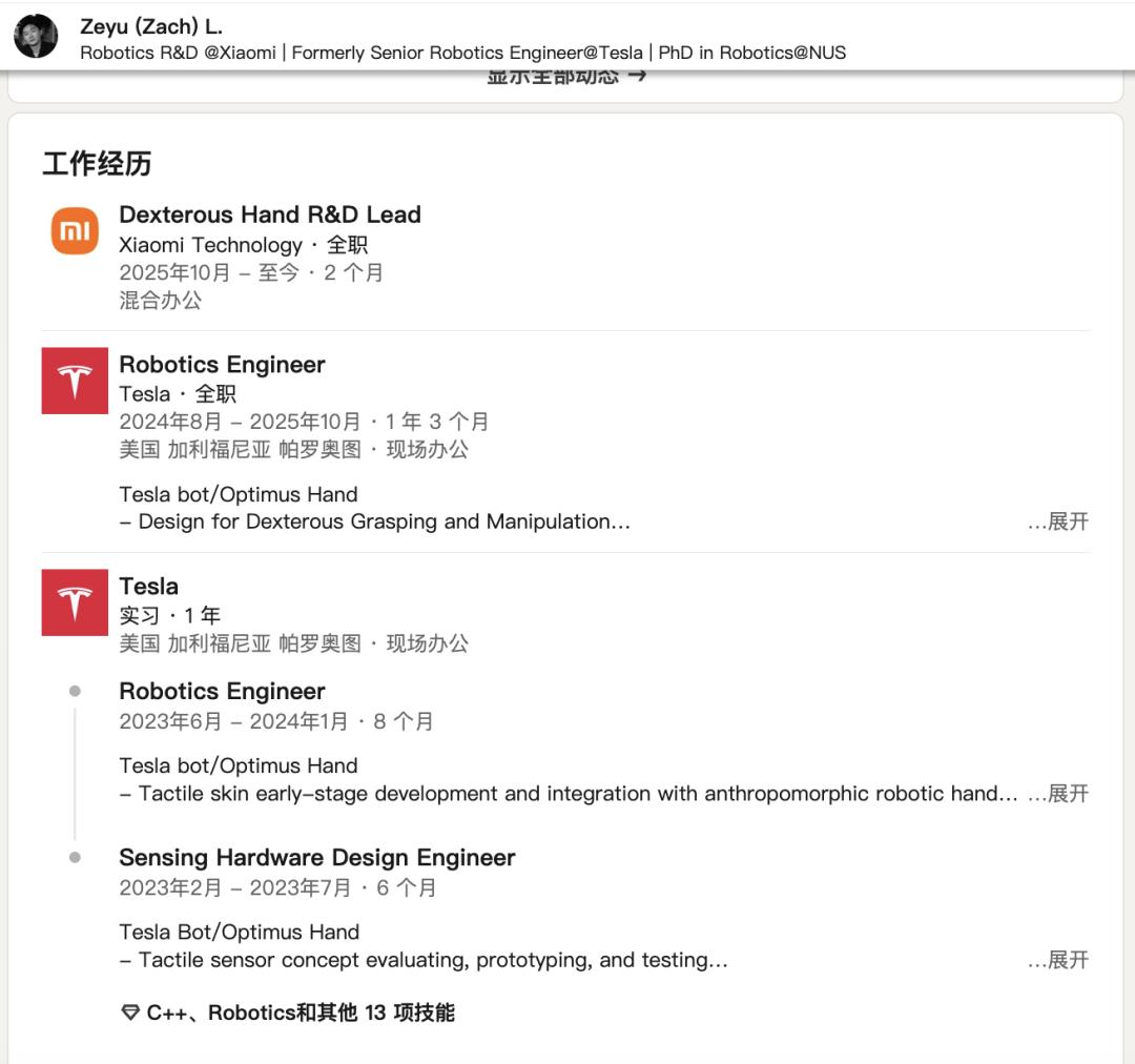 这不,前特斯拉 Optimus 灵巧手团队成员卢泽宇,最近也在社交平台公开了自己加入小米机器人团队的消息,接过灵巧手负责人这一要职。