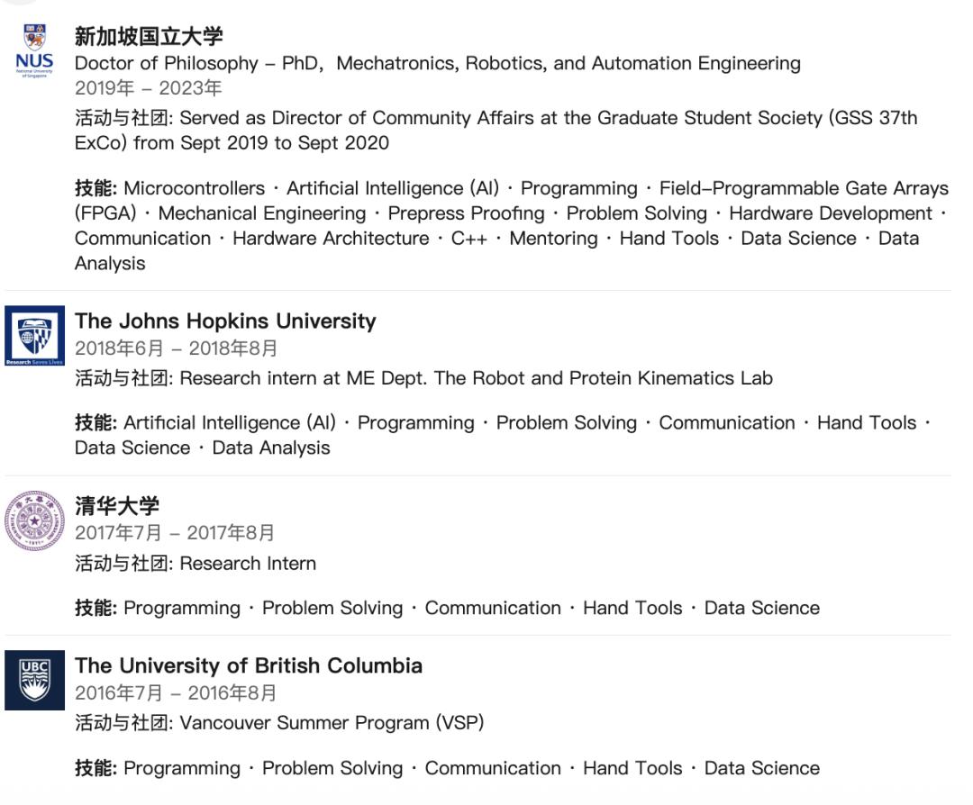 在读博之前,他还曾前往多所名校参加科研实习,积累了机器人运动学与智能系统方面的实践经验。