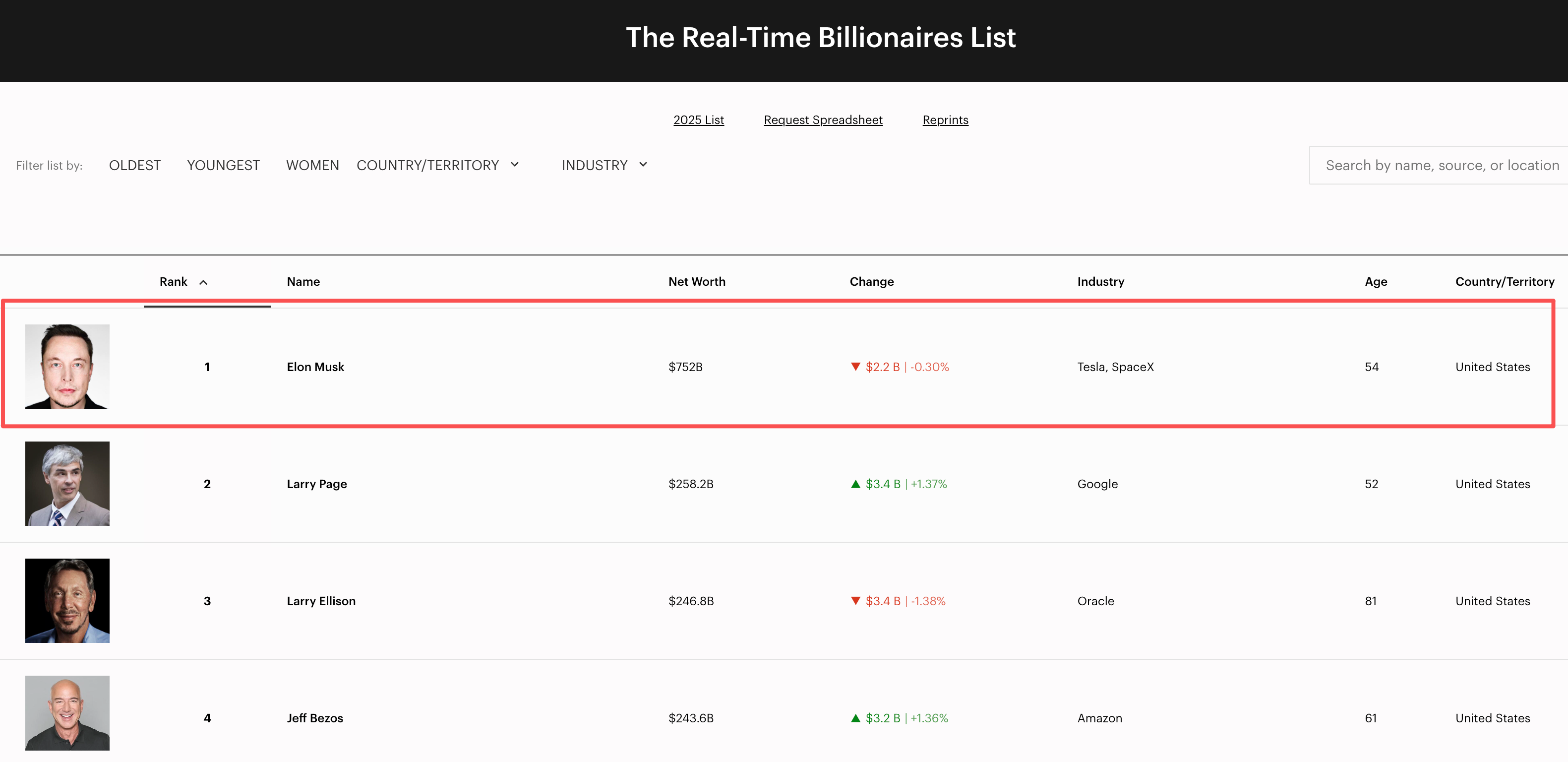 彭博亿万富翁指数显示,马斯克现在的净资产高达6470亿美元,今年以来已经增加了2150亿美元,遥遥领先于第二名的拉里·佩奇(Larry Page)。《福布斯》富豪榜则显示,马斯克的财富已经达到7521亿美元。