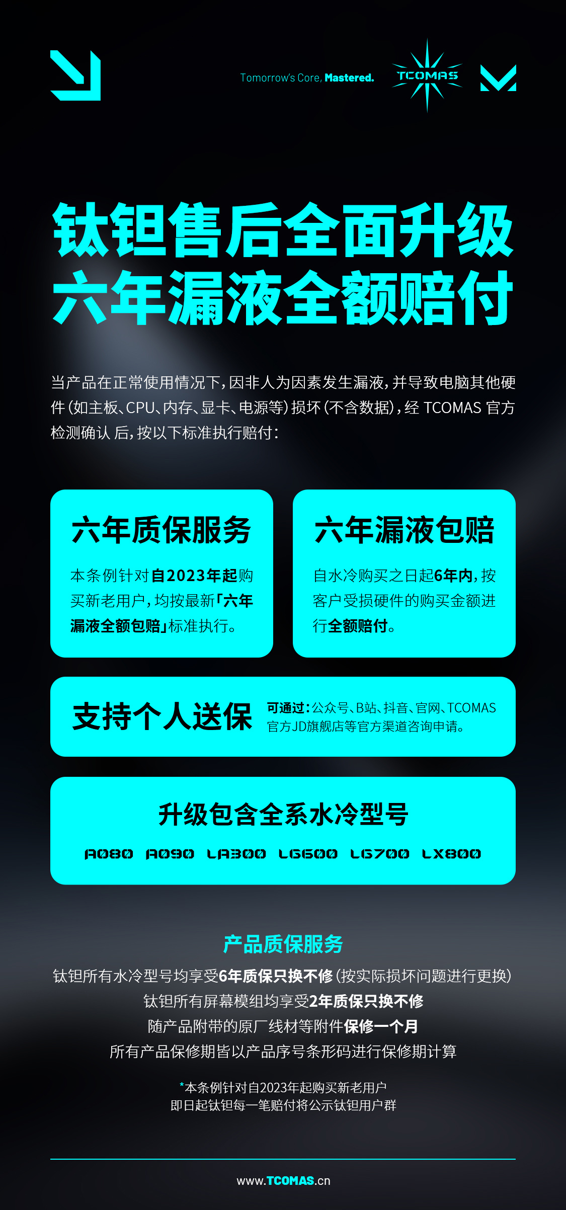 IT之家 1 月 23 日消息,散热与机箱厂商 TCOMAS 钛钽本周宣布,旗下全系水冷在 6 年质保期内出现非人为因素漏液致使其它硬件损坏的,将按受损硬件原购金额全额赔付,用户亦可选择受损硬件同型号赔付。